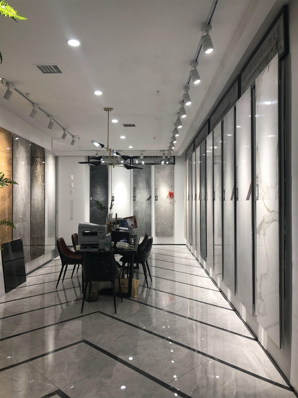 這是大板的選材區(qū),選用打豎的陳列方式,射燈照射下的產(chǎn)品,干凈、整潔、大氣、直觀。