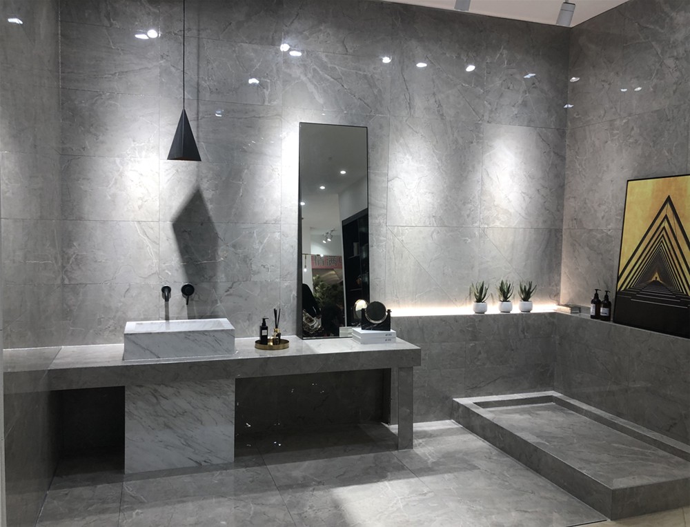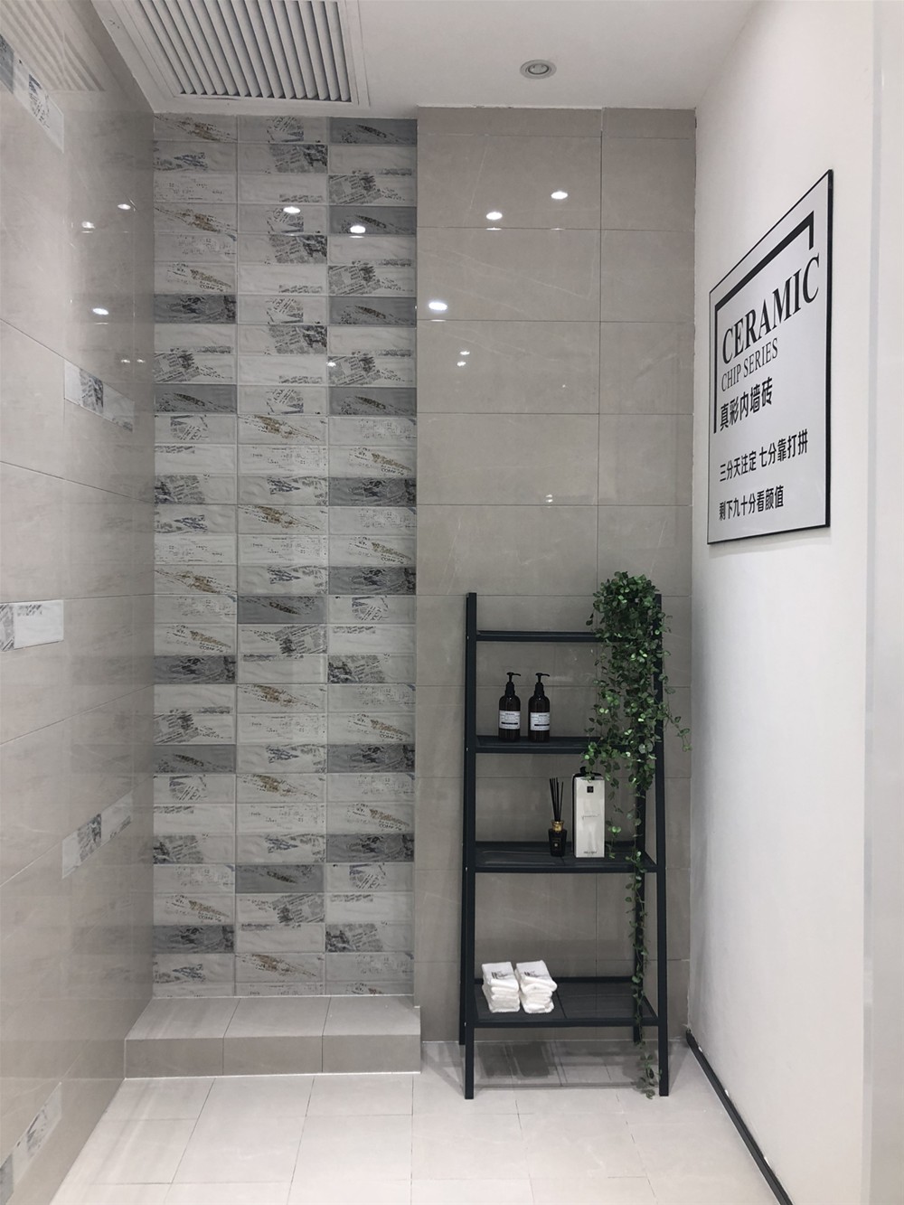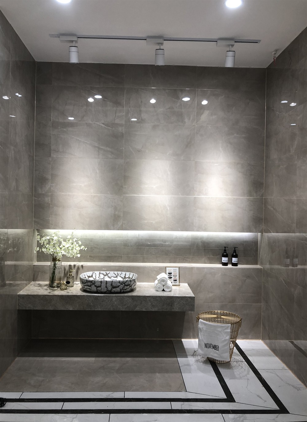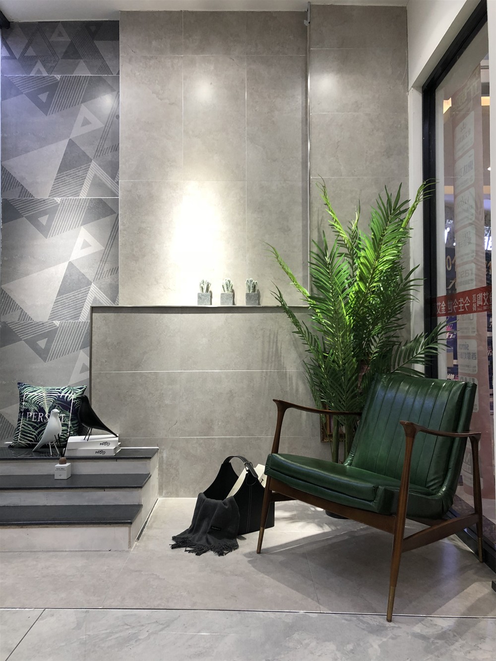 墻面可作電視背景墻、客廳地磚、沙發(fā)背景墻、廚衛(wèi)用磚。高級灰亮面磚深受年輕人喜愛,也很好搭配突出空間效果。