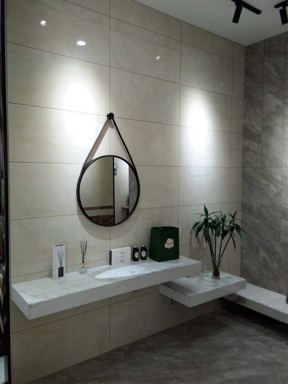 這是一個(gè)通體大理石瓷磚的模擬間,模擬了洗手間/客廳背景墻的立體空間,通過灰色和米色的冷暖色搭配,體現(xiàn)了整個(gè)空間的層次感。