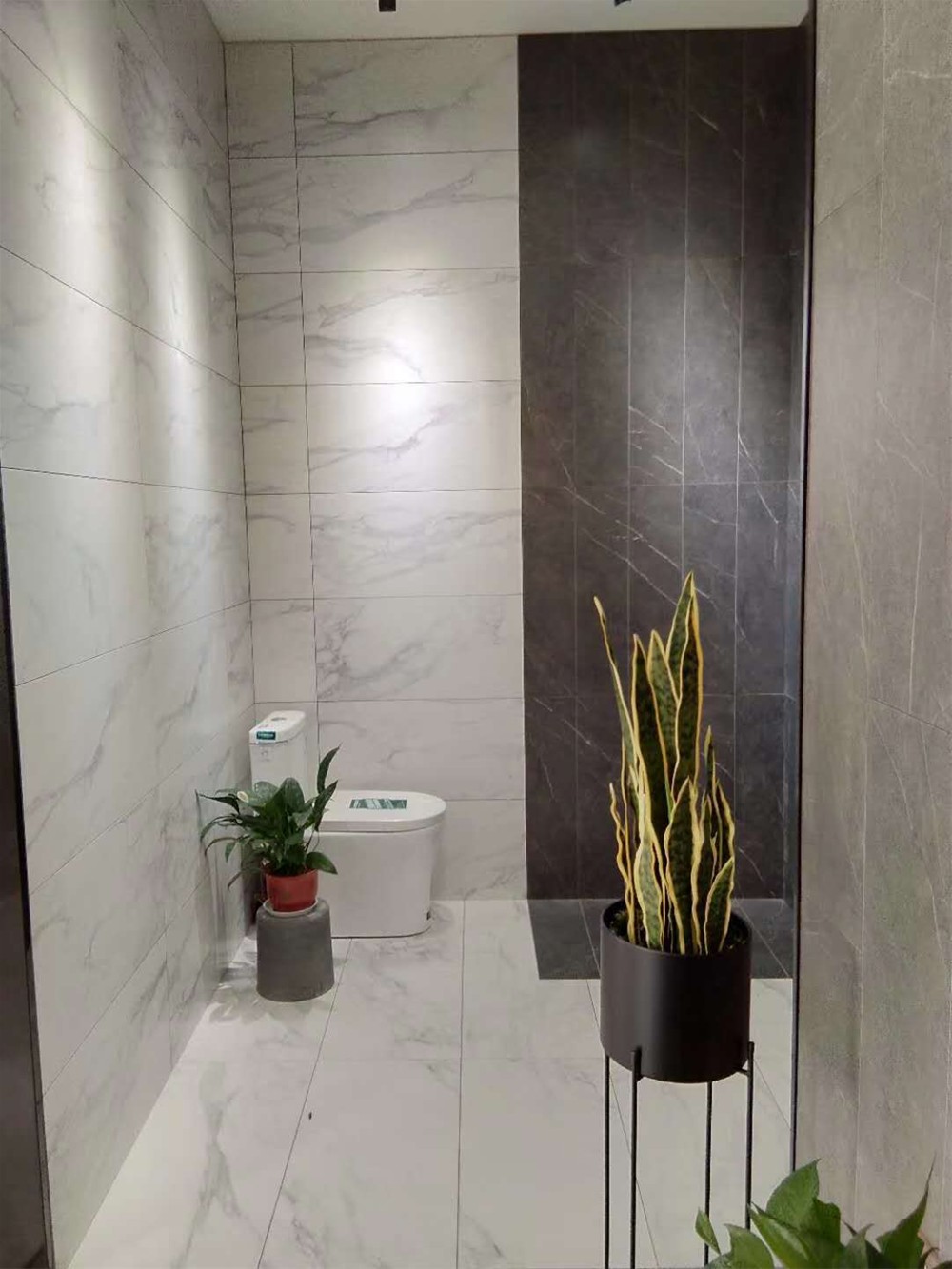 這是一個(gè)15°緞光釉的模擬間,一深一淺的顏色把衛(wèi)生間的干濕區(qū)域區(qū)分開來,小空間用白色瓷磚鋪設(shè)看起來寬敞明亮。