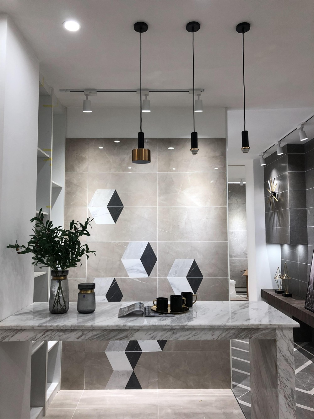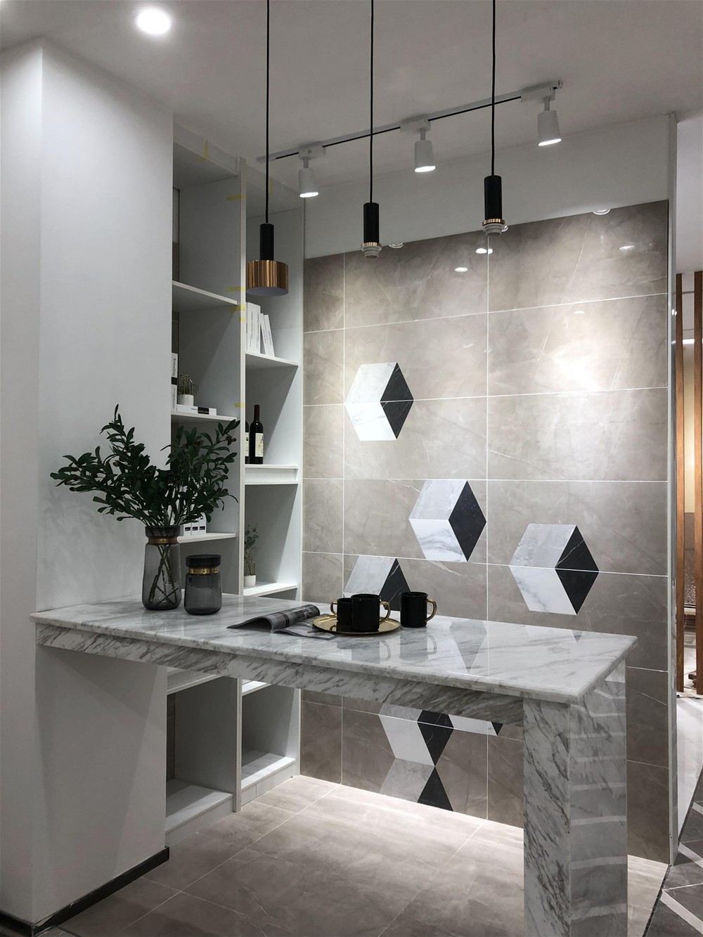 這是吧臺(tái)模擬間,由九面通體大理石和緞光釉不同規(guī)格、產(chǎn)品、顏色鋪貼的墻面,個(gè)性、時(shí)尚,搭配大理石吧臺(tái)和金屬軟裝,營(yíng)造出輕奢的質(zhì)感。