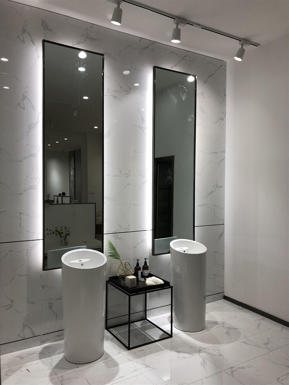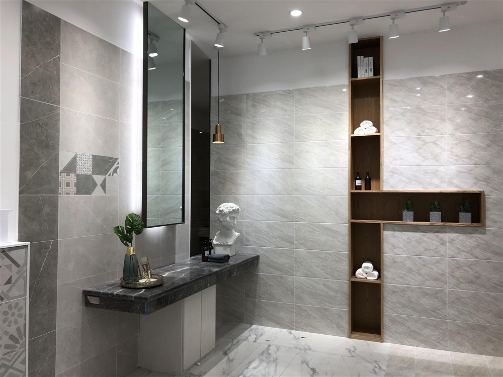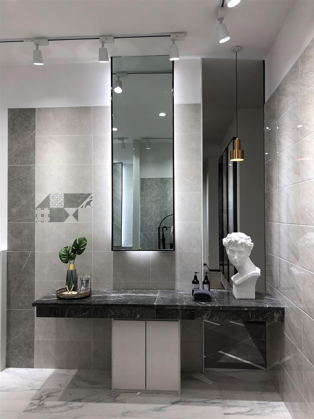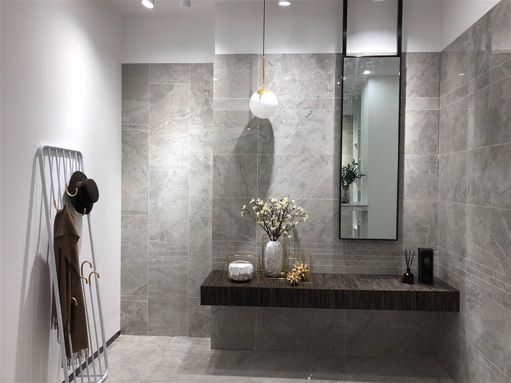 這是灰色調(diào)的衛(wèi)生間模擬間,瓷磚選用通體大理石亮面磚,上墻下地都能鋪,現(xiàn)代簡(jiǎn)約風(fēng)和輕奢風(fēng)都十分適用。