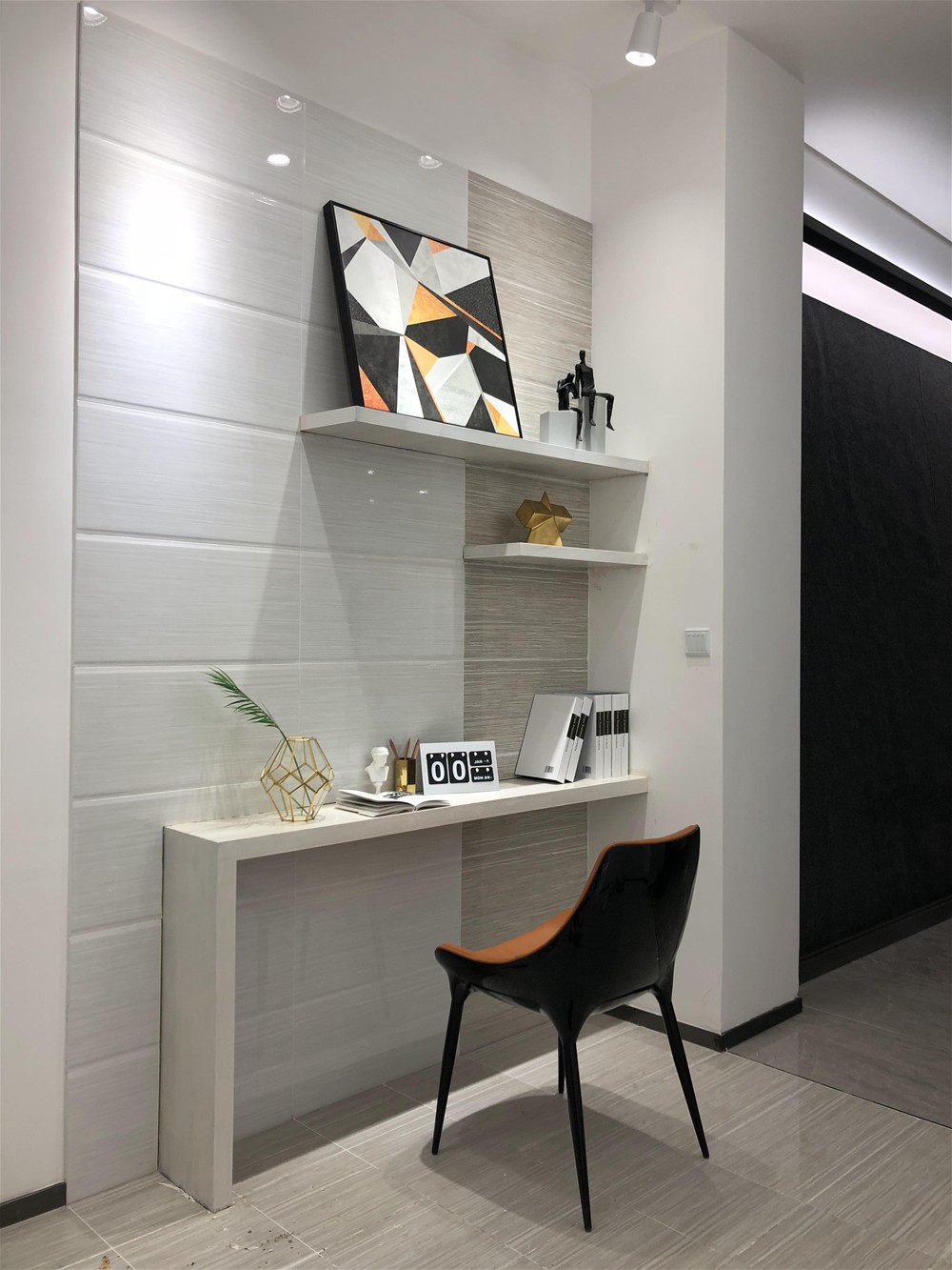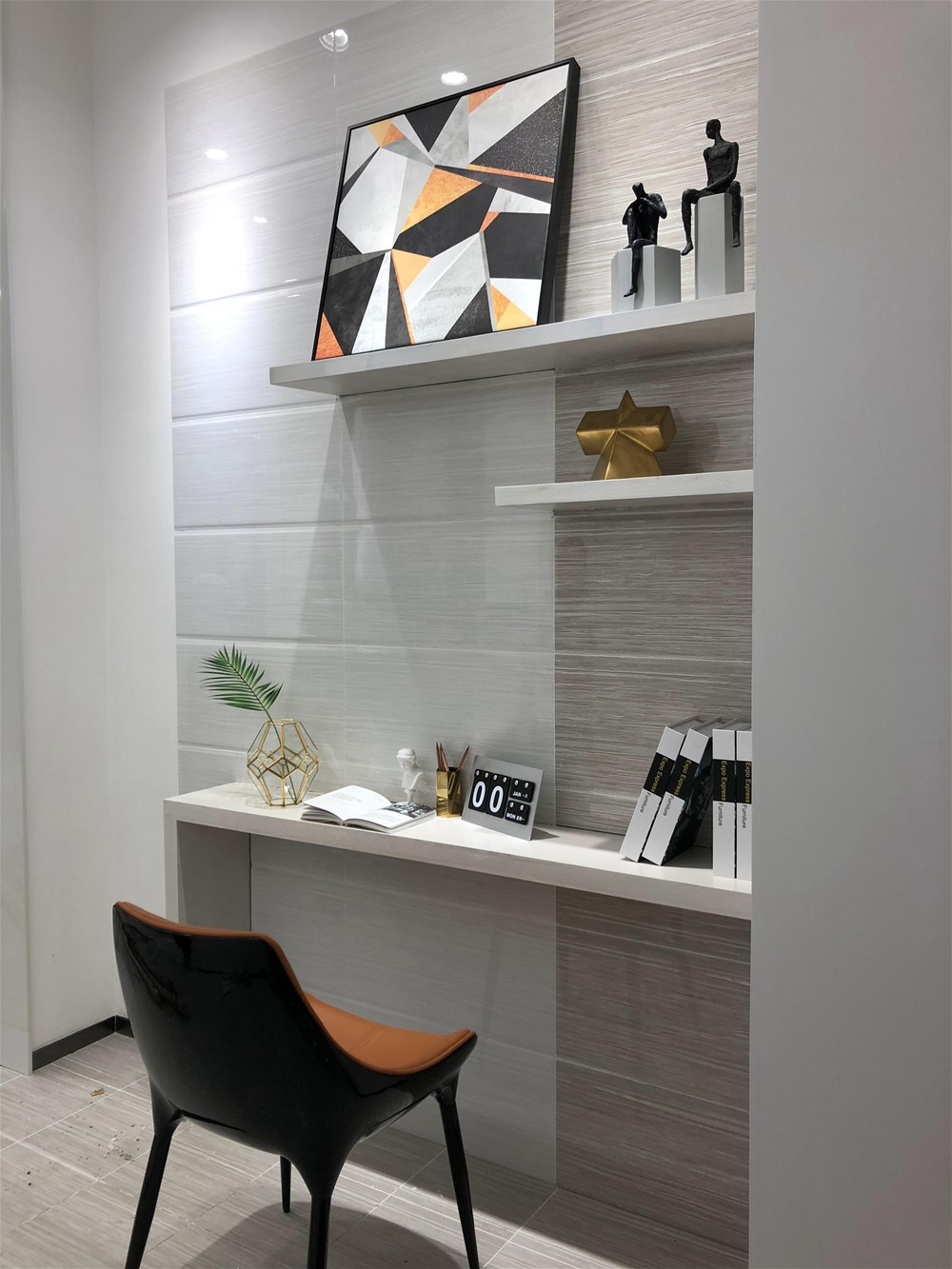 這是由噴墨瓷片鋪貼的書(shū)房墻面,亮面磚易于打理,磚面線(xiàn)條簡(jiǎn)潔舒適。