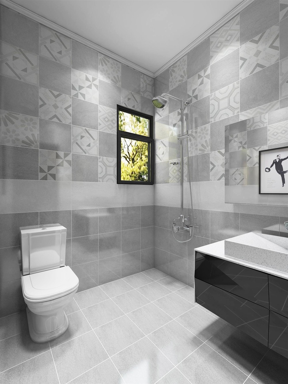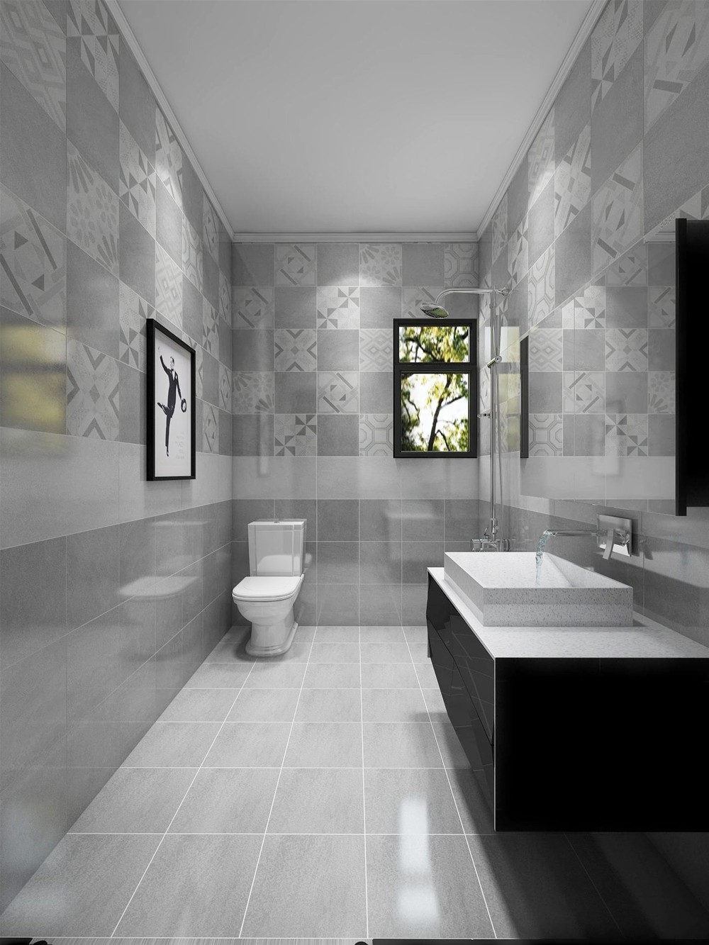 家用衛(wèi)生間講究私密性,設(shè)計師選用淺灰色的噴墨瓷片,這是一款應(yīng)用范圍廣泛的產(chǎn)品,一深一淺與花片搭配使用讓空間不會過于單調(diào)。