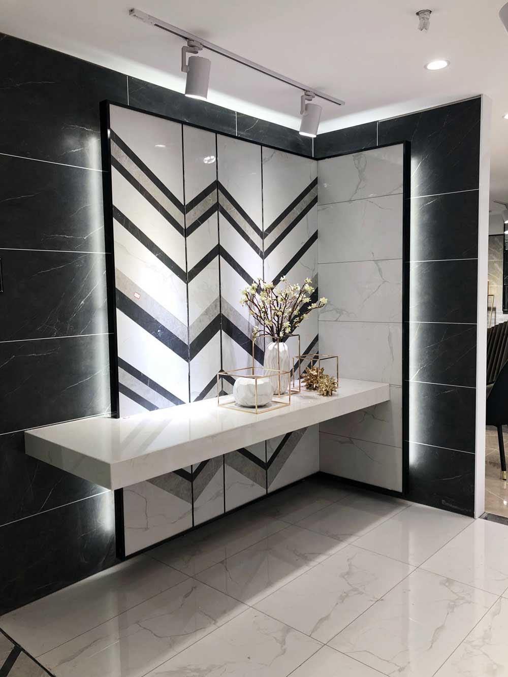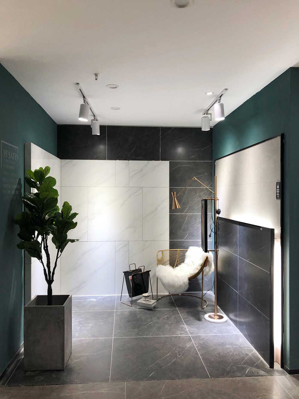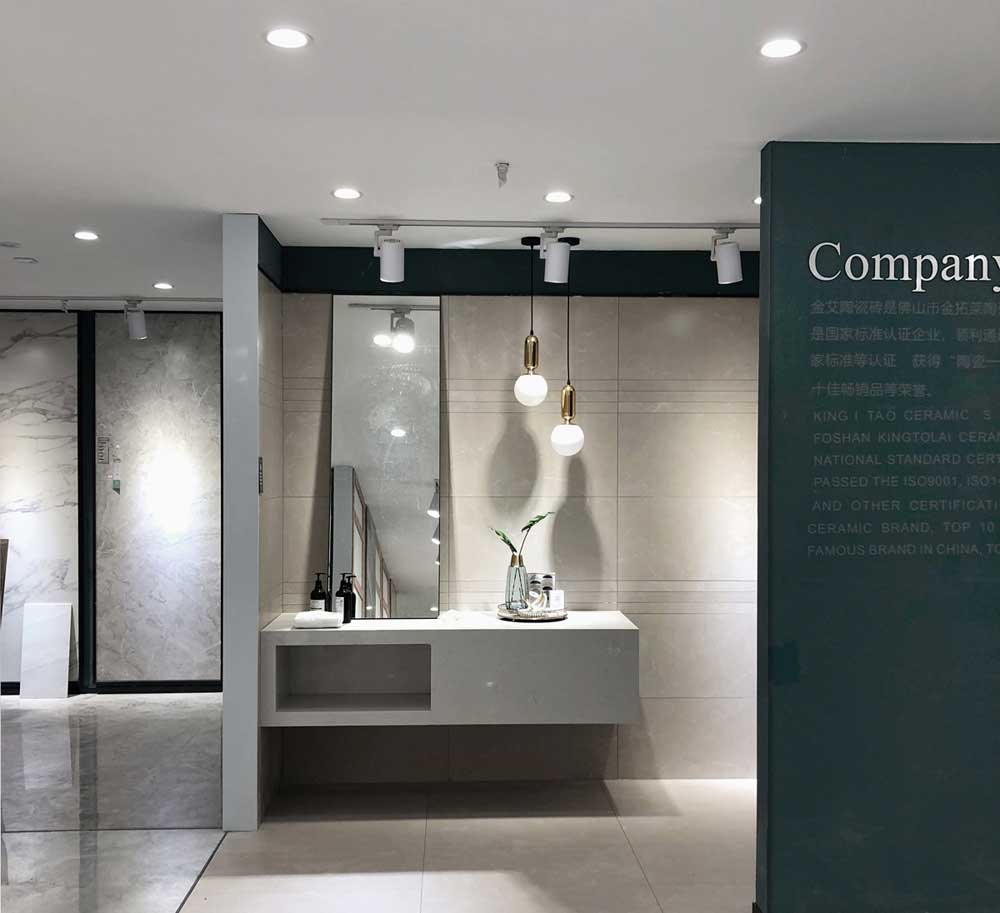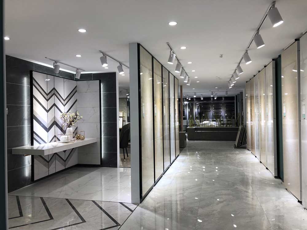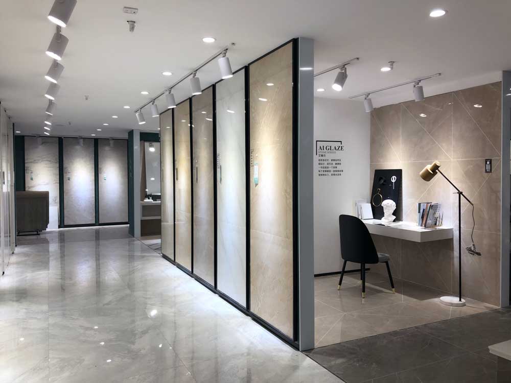 這里是我們店800x800規(guī)格產(chǎn)品的選材區(qū),通過射燈的照射下產(chǎn)品紋理是不是清晰多了?選材區(qū)過道選用淺色磚是為了區(qū)分產(chǎn)品,不至于喧賓奪主。家里裝修也要考慮好顏色搭配和空間主次哦。