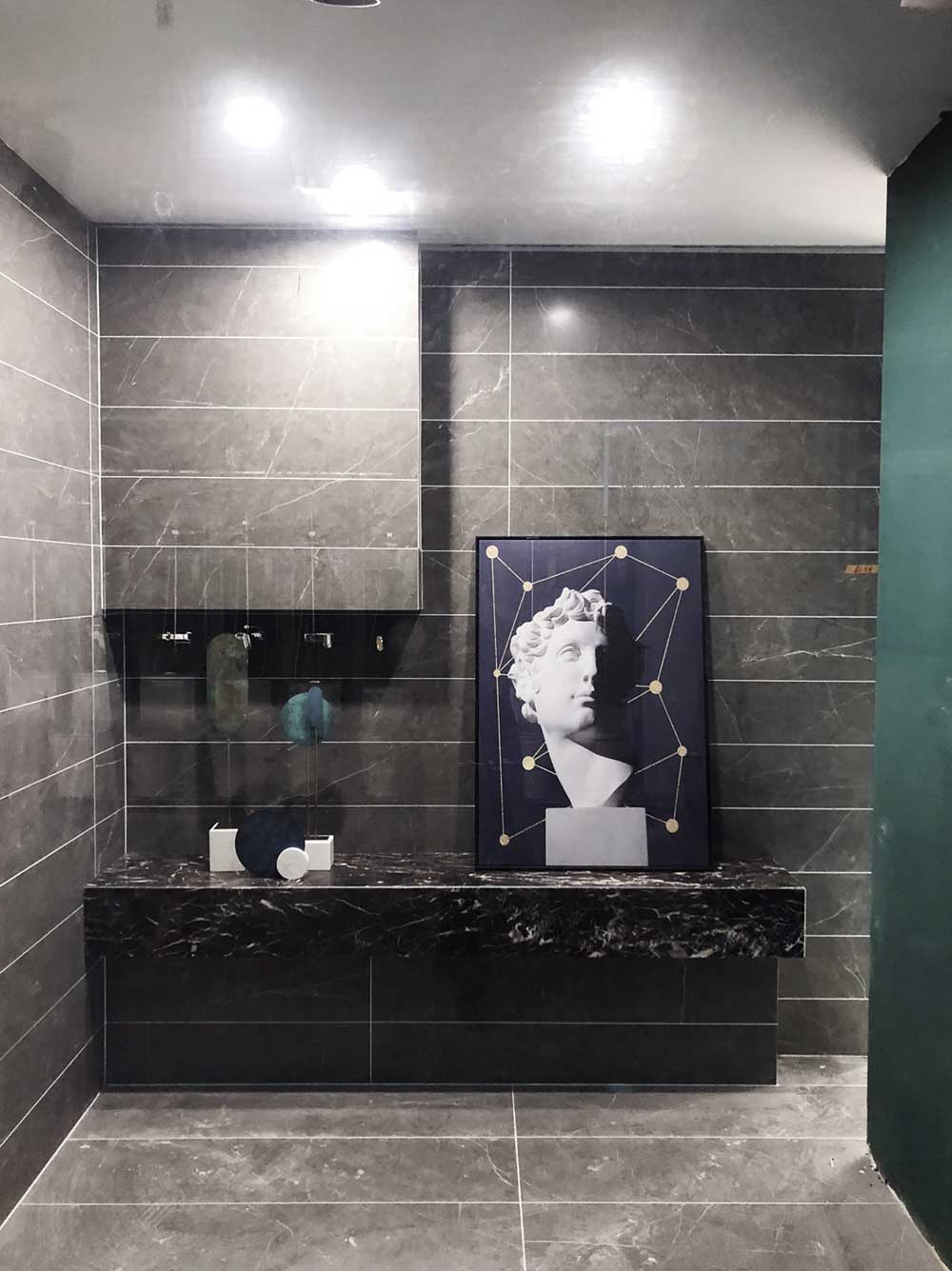 這是輕奢風(fēng)格的衛(wèi)生間,區(qū)別于傳統(tǒng)衛(wèi)生間的鋪貼設(shè)計(jì),選用的是九面通體大理石KA9M61205雅士白、KA9M61207閃電灰、KB9M61208卡門深灰,切割規(guī)格不一,個(gè)性又和諧,背景選用15°緞光釉KFD8808保加利亞灰,一深一淺的顏色碰撞出視覺沖擊,這種大膽的設(shè)計(jì)手法很受年輕消費(fèi)者喜愛,融合了青春館創(chuàng)新、活力的品牌元素。這空間產(chǎn)品同樣適用于客廳地面、廚房墻面等。