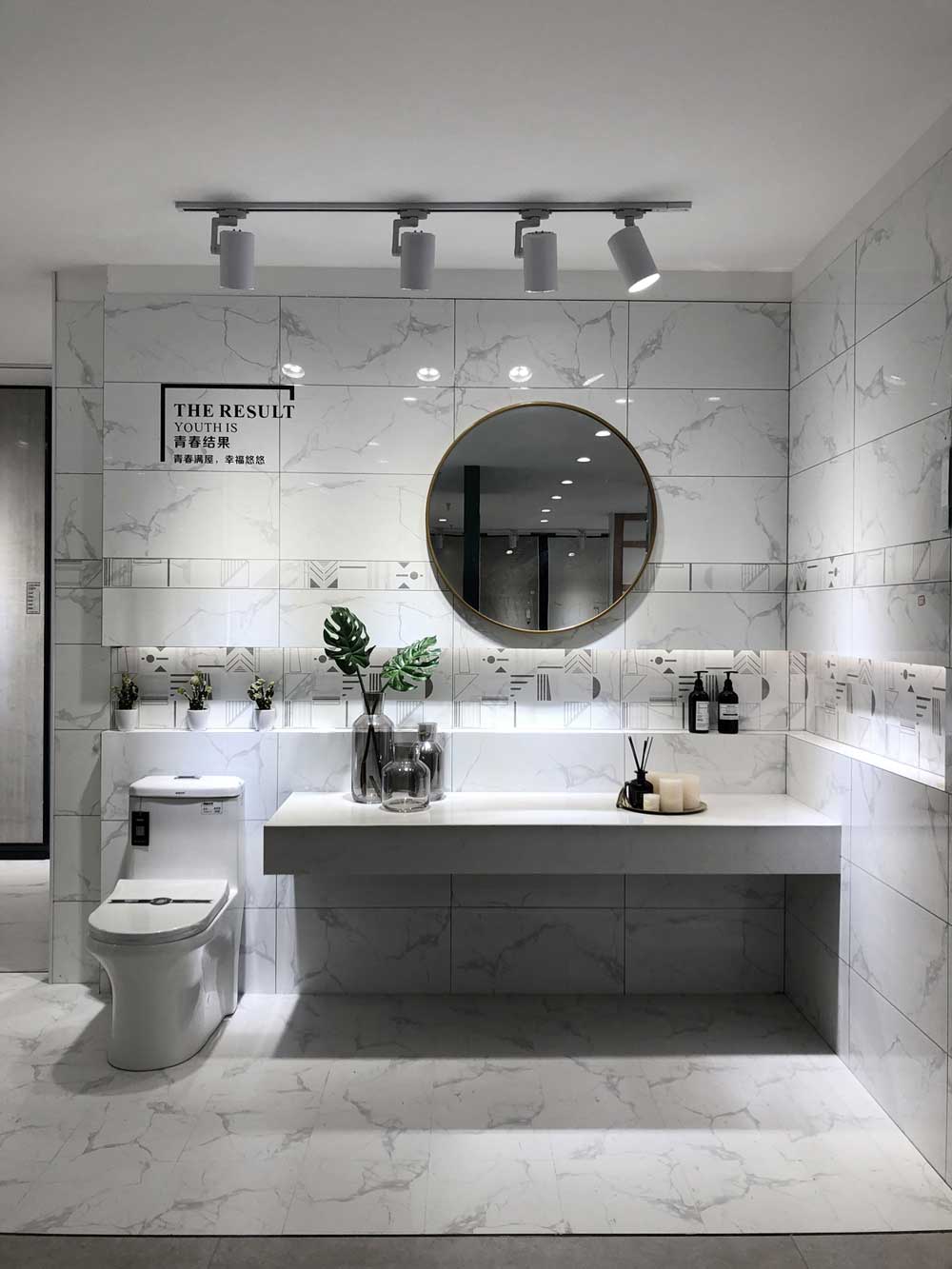這個(gè)輕奢衛(wèi)生間選用的是噴墨瓷片KPM36088的配套產(chǎn)品,面積雖小,但看上去是不是挺寬闊明亮的?這就是白色磚的優(yōu)點(diǎn),且衛(wèi)生間通常比較潮濕,選用白色磚給人潔凈明亮的感覺。使用感非常舒適。