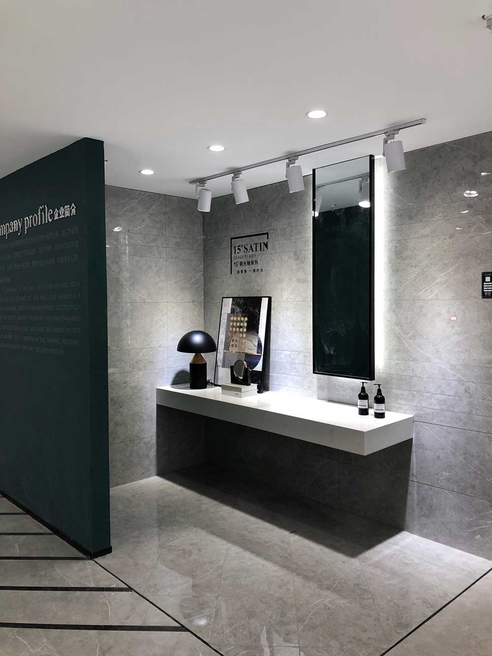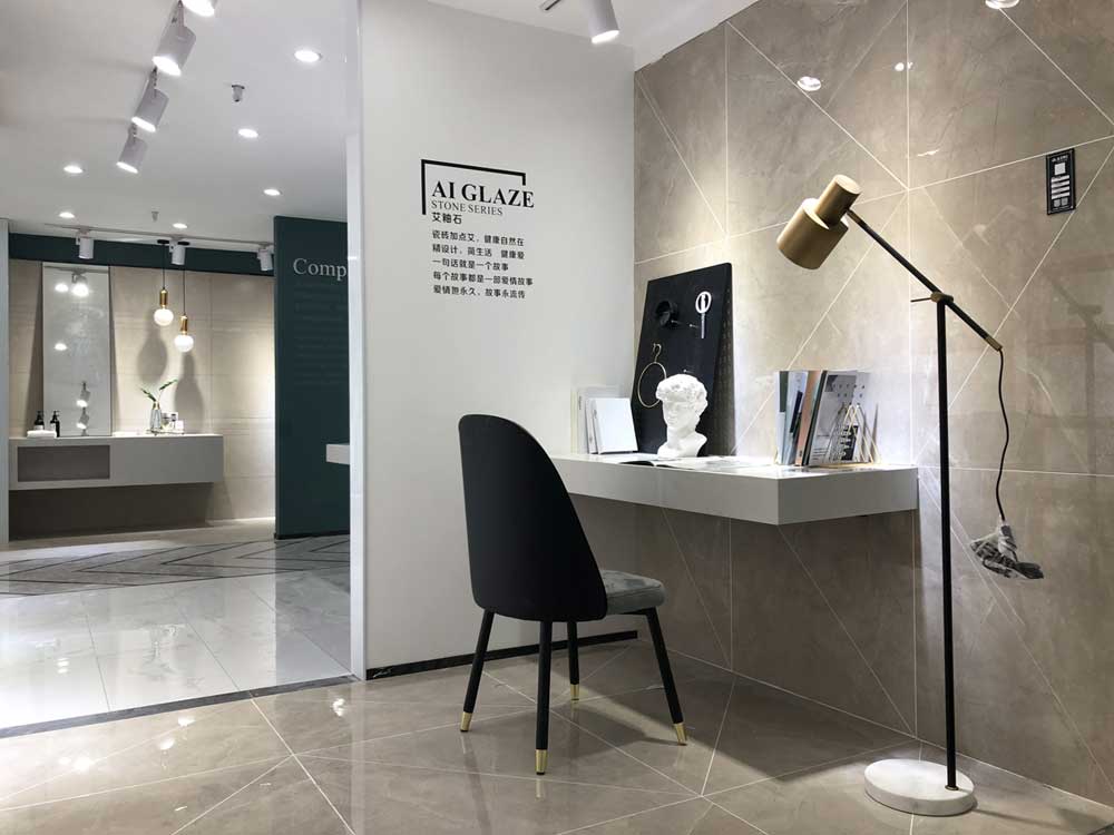這是現(xiàn)代簡(jiǎn)約書房的模擬間,鋪貼的是艾釉石KYP8118潘多拉灰,艾釉石是我們店里的明星產(chǎn)品,同行人都知道我們的磚釉面比別人亮,耐臟耐磨,因?yàn)槲覀冇凶约旱挠粤瞎荆灾餮邪l(fā)釉料。再說灰色磚給人安靜的感覺,書房選灰色就沒錯(cuò)了。