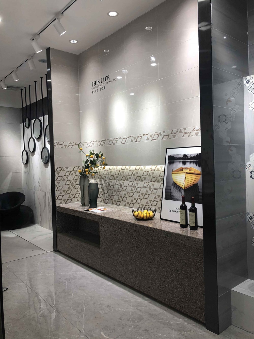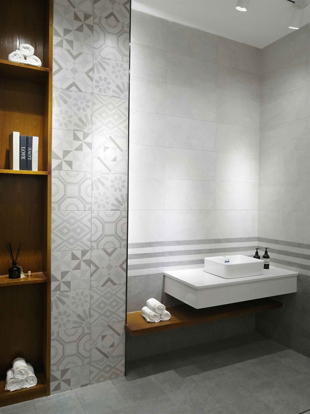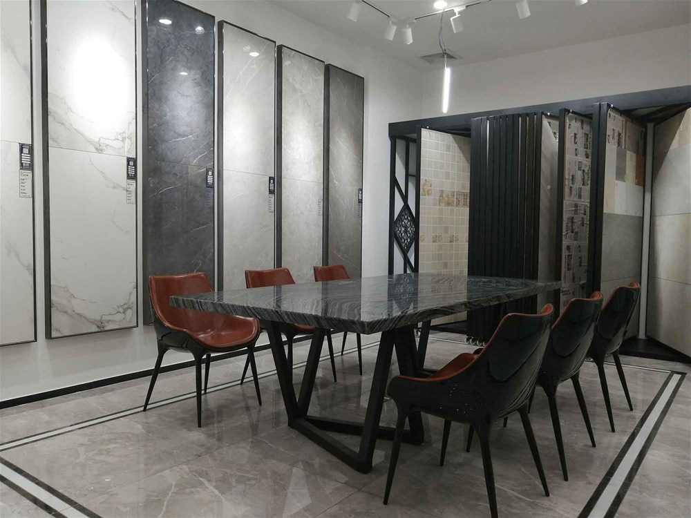 往里邊走,這是我們的選材區(qū),這里集合了200多個瓷磚花式,有通體大理石、15°緞光釉、噴墨瓷片、瓷拋磚、艾釉石、仿古磚等,噴墨瓷片都是配套產(chǎn)品,這邊拉開來就能直觀看到它的鋪貼效果。您再看,地面也是灰色瓷磚鋪貼的效果,您家客餐廳都適合這樣鋪設的。
