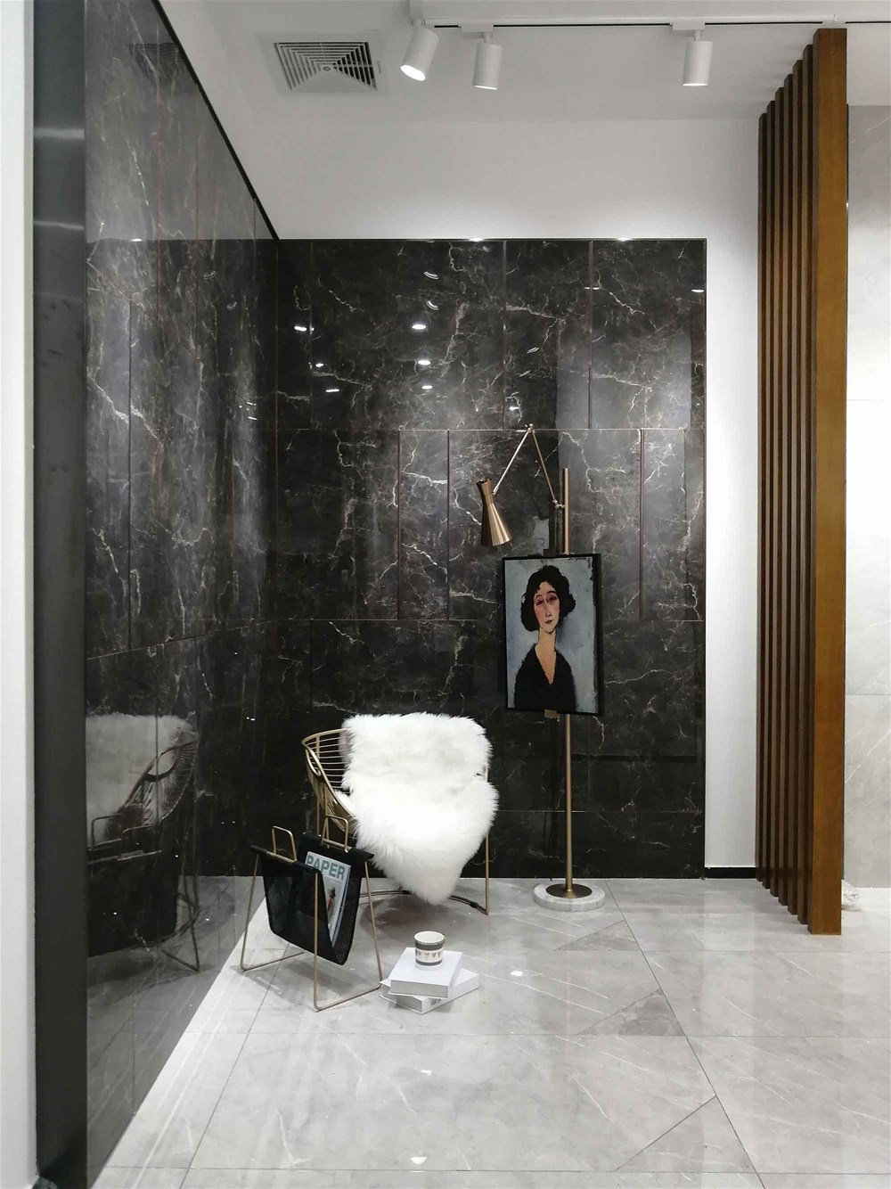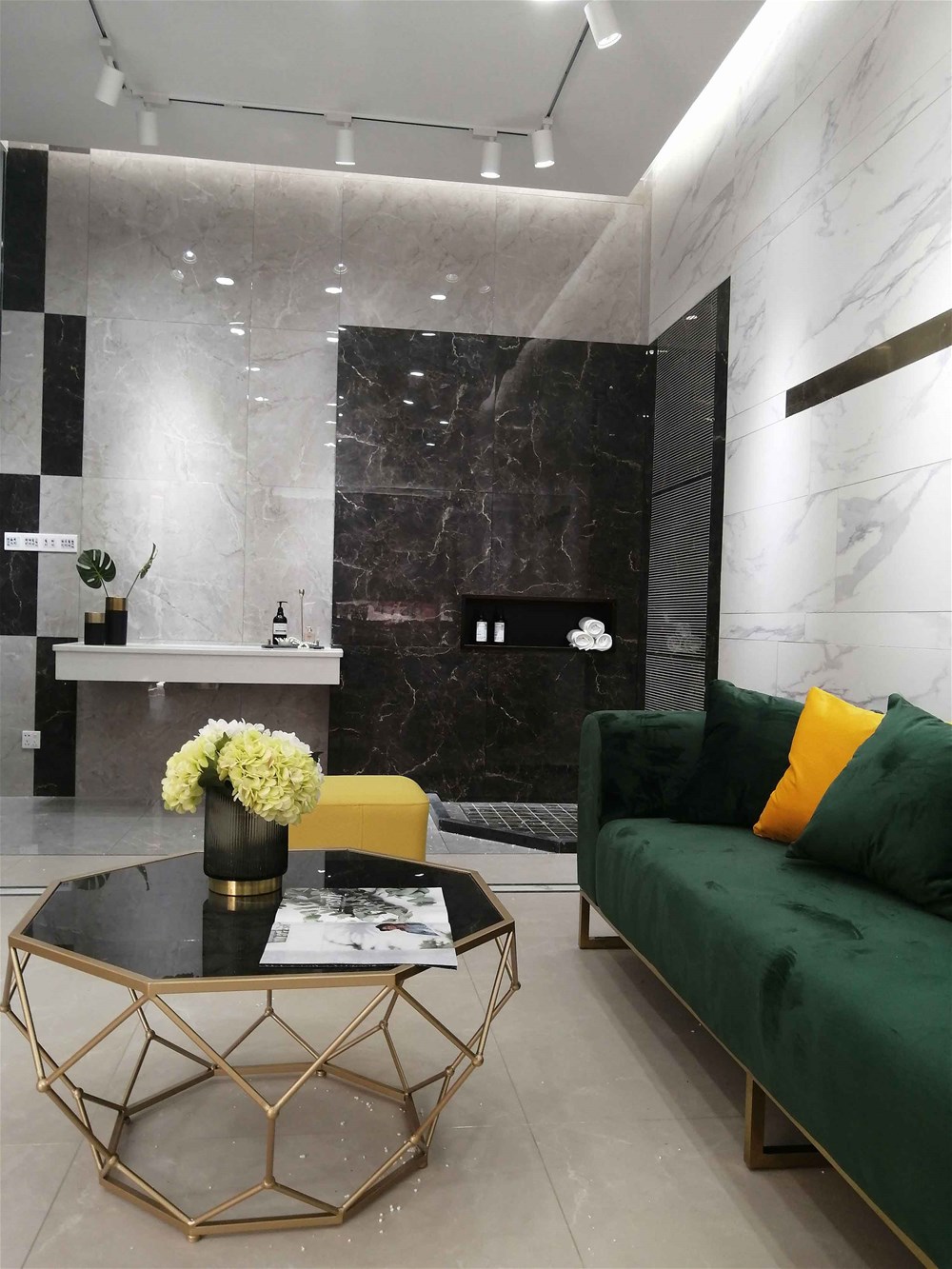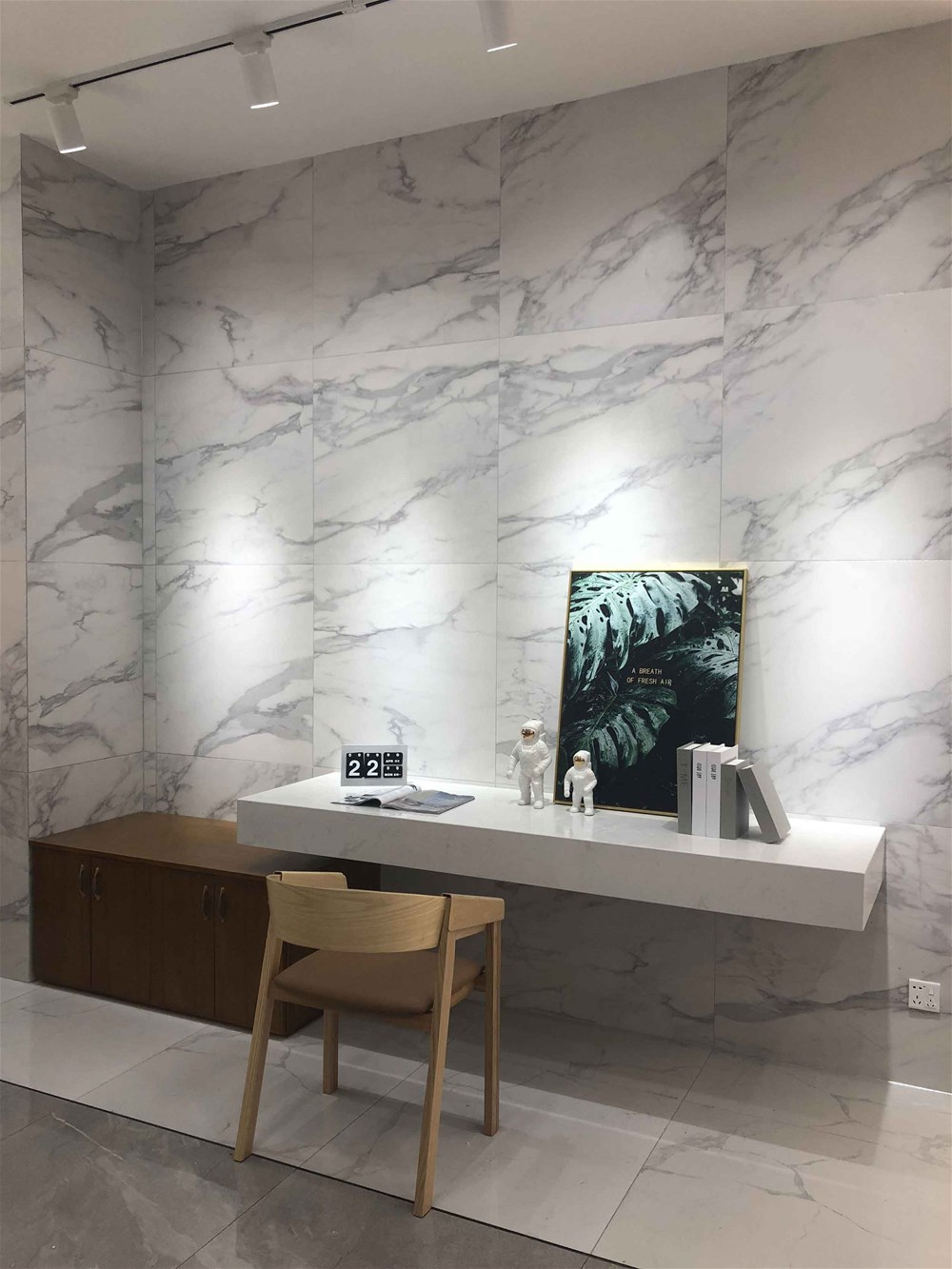 這是我們的前臺,logo背景墻選用九面通體大理石KA9M61209直鋪,灰色大紋理營造出簡約、優(yōu)雅、大氣的空間氛圍,家里客廳電視背景墻、地面同樣適用。這是近兩年家居裝修非常流行的顏色,不知道您喜不喜歡呢?