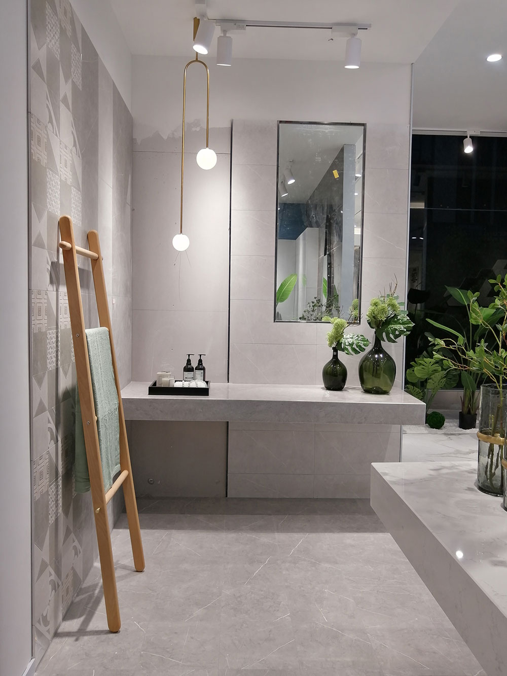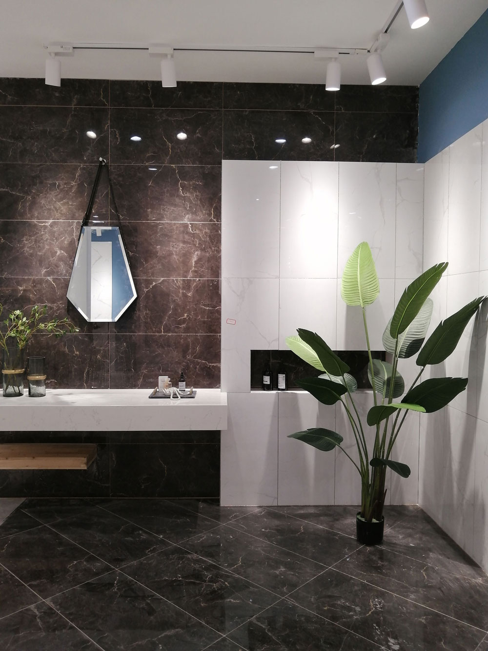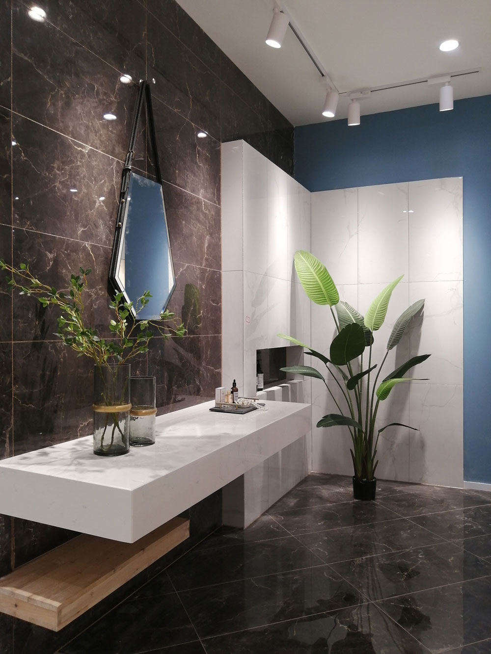 由通體大理石達(dá)曼深咖KTB9818/雪花白KTA9821切割成400*800鋪貼,墻面與地面選用同一款磚,營(yíng)造和諧統(tǒng)一的空間氛圍,右邊墻面選用白色瓷磚鋪貼,使得整個(gè)空間層次分明,綠植點(diǎn)綴的空間盡顯生機(jī)與活力。