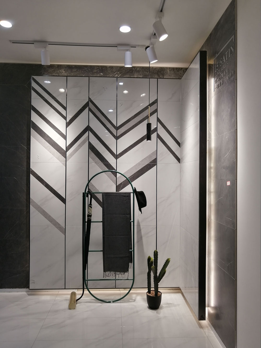 墻面是由艾釉石KYP8101水刀切割鋪貼,黑白灰對(duì)比強(qiáng)烈,空間層次分明,區(qū)別于傳統(tǒng)的直鋪,彰顯年輕人個(gè)性、大膽的需求。白色作為主色調(diào),最有包容性的顏色,可以和任何顏色進(jìn)行搭配,在這個(gè)空間,白色與灰色、黑色讓整個(gè)空間富有藝術(shù)感和時(shí)尚感。