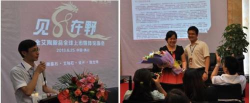 2013年6月25日,在金艾陶產品展廳,“見龍在野”——金艾陶新品全球上市新聞媒體見面會在金艾陶南莊華夏展廳順利舉行,正式對外宣告,金艾陶微晶石、艾釉石(健康超平釉)、瓷片、拋光磚等全系列產品全球上市。陶城報、陶瓷信息報、新浪、搜狐、鳳凰網、中國陶瓷網、陶瓷資訊、建材周刊、今日陶瓷、華夏陶瓷網等新聞媒體的朋友,一起匯聚在金艾陶產品展廳,探尋金艾陶瓷磚品牌背后神秘的故事。
