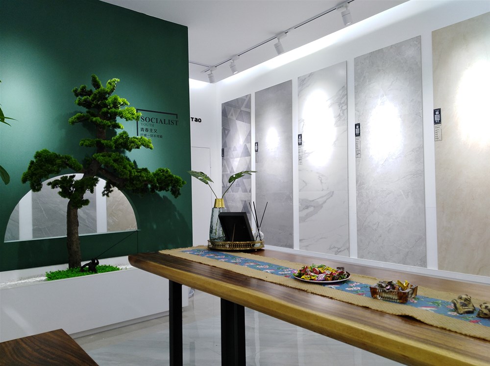 這邊走就是我們的選材區(qū),我們品牌主打規(guī)格有300*300、300*600、150*900、800*800、600*1200、900*1800等,15°護(hù)眼緞光釉系列、亮面通體大理石、健康艾釉石、現(xiàn)代仿古磚、配套噴墨內(nèi)墻磚一應(yīng)俱全,每一款花式獨特且耐看,滿足全屋用磚要求。