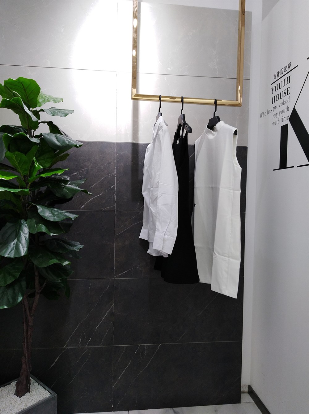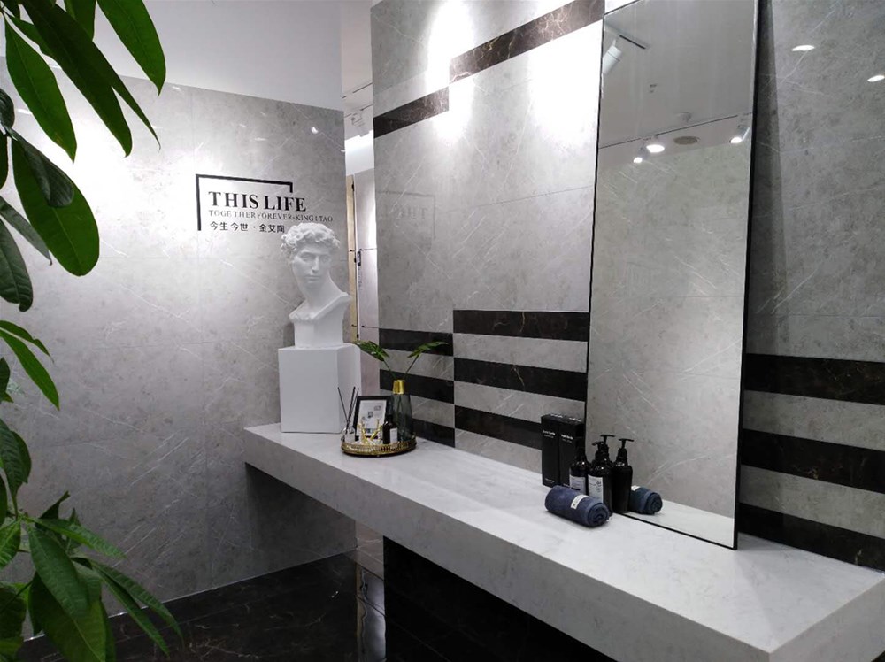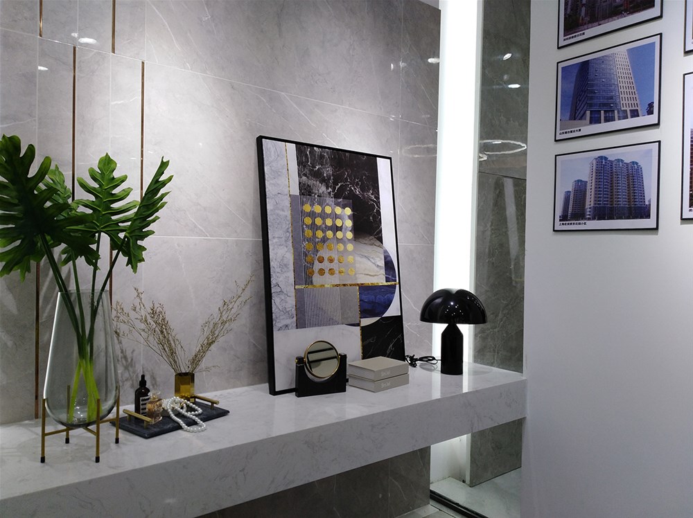 這是前臺接待區(qū),背景墻選用網(wǎng)紅規(guī)格600*1200mm尼泊爾灰KA9M61209通鋪,簡潔中不失優(yōu)雅的一款灰色調(diào)瓷磚,這款產(chǎn)品鋪貼到你家電視背景墻、客餐廳地磚同樣適合。不知道您覺得怎么樣?