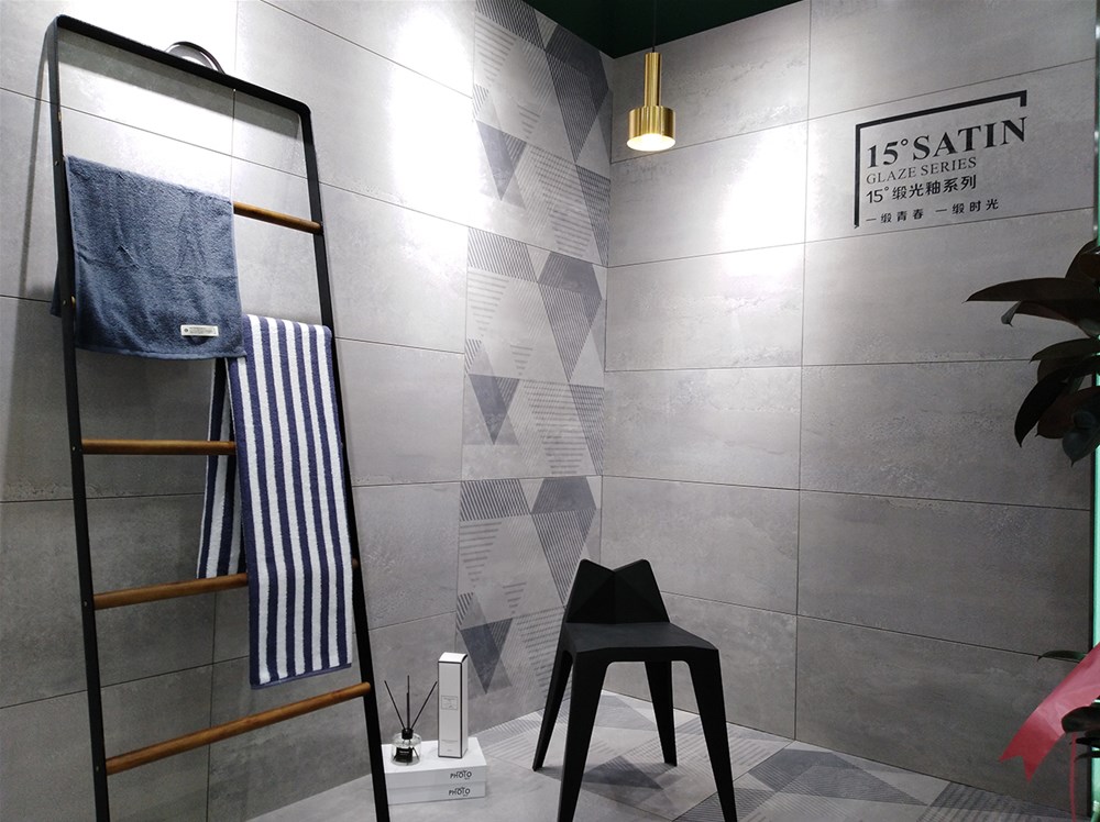 這是由15°緞光釉KFD8806銀線灰洞與KFD8806HP克洛諾斯灰加工成400*800拼鋪衣帽間,簡潔明朗的三角形圖案作為墻面的點綴過渡,盡顯現(xiàn)代簡約韻味,營造個性小資的空間氛圍。