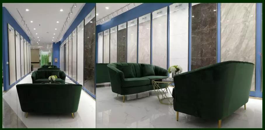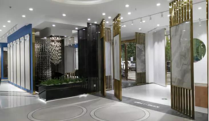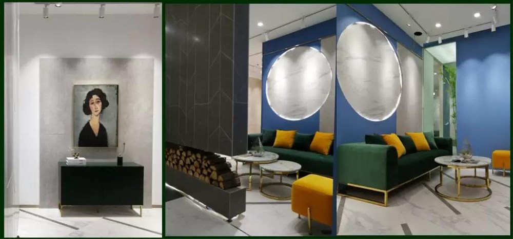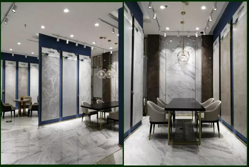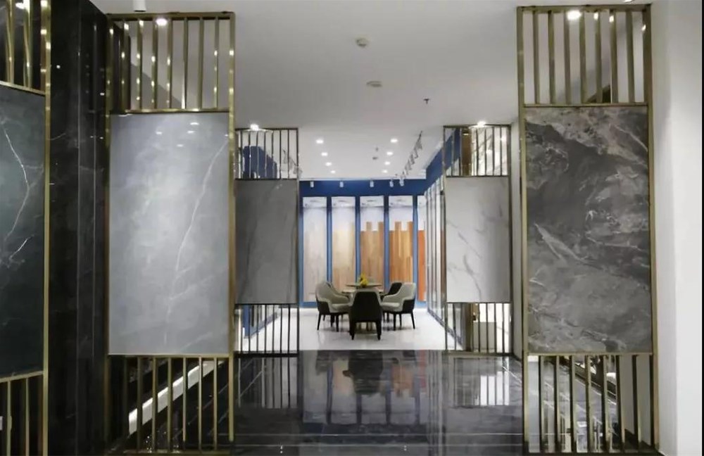900*1800的大板以屏風(fēng)的形式展現(xiàn),不但很巧妙的體現(xiàn)了大巖板系列產(chǎn)品的紋理和設(shè)計感,而且通過系列的屏風(fēng)展示很巧妙的把大堂區(qū)域兩邊劃分為接待區(qū)和洽談區(qū),靜/動兩個區(qū)。
