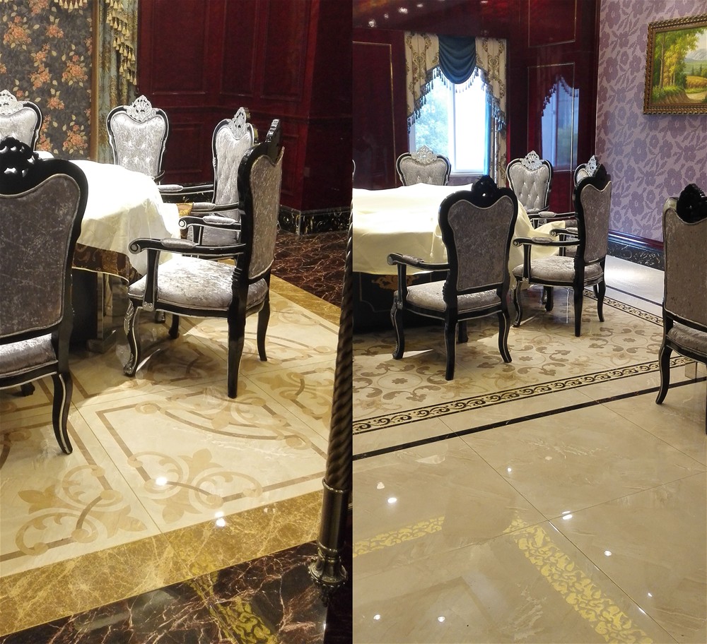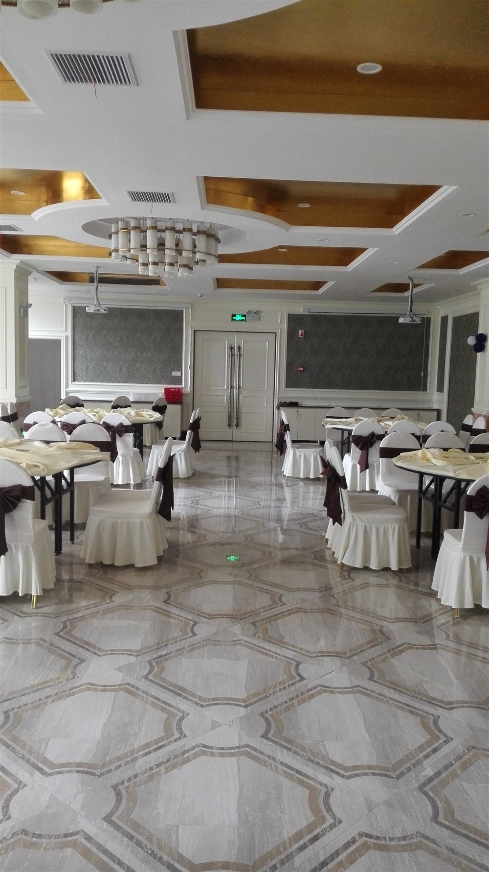 鹽城東林海岸大酒店內(nèi)部裝飾,全部采用金艾陶瓷磚的產(chǎn)品進(jìn)行裝飾鋪貼。餐廳及包間應(yīng)用了金艾陶瓷磚愛(ài)丁堡系列拼花KYP8055H、KYP8062H、KYP8069H和愛(ài)特大理石金黃天龍KYP8085,包間茶水間墻面采用曼彩時(shí)尚KPM36053鋪貼。酒店過(guò)道則采用愛(ài)特大理石金黃天龍KYP8085與黑金花KYB8017進(jìn)行搭配。