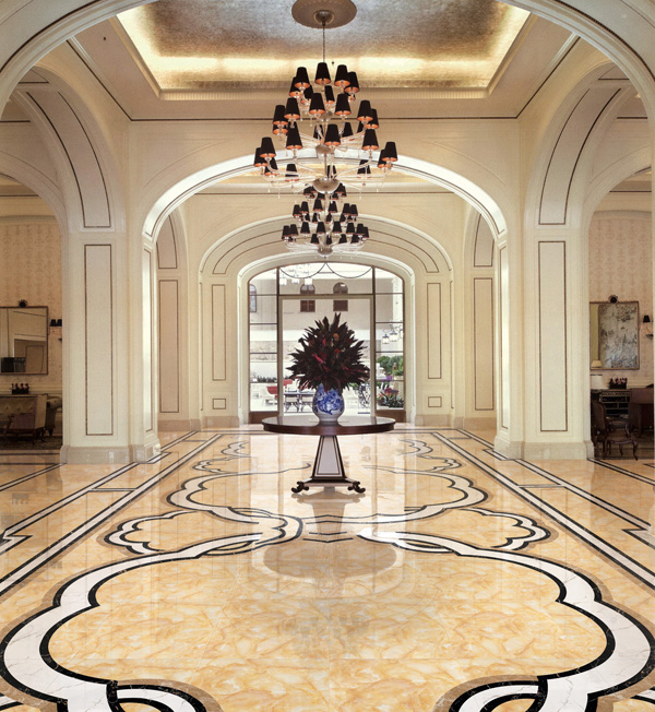 此高級(jí)大堂運(yùn)用陶瓷一線品牌金艾陶玉石瓷磚煙霞玉KYP8023瓷磚鋪貼,保留原有的寶玉的特質(zhì)賦予了奢靡,華麗加以拼花、波打線的搭配更是彰顯一種生活態(tài)度、一種品味、一種格調(diào)的象征。使整個(gè)大堂粗獷大氣、外觀高雅,名士尊貴,經(jīng)典永鑄!