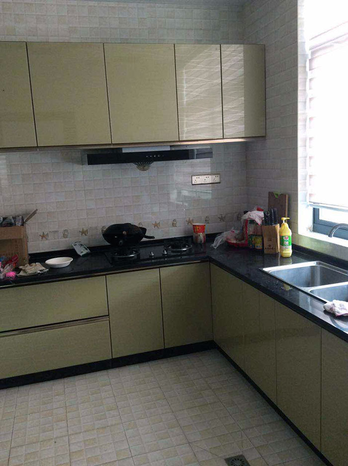 櫥柜以當下流行的土豪金色為主色調(diào),臺面選用黑色大理石,高端、大氣!地面鋪貼金艾陶內(nèi)墻磚KPA36057系列,易于打理的同時又可呈現(xiàn)出如馬賽克般的美感,精美絕倫。