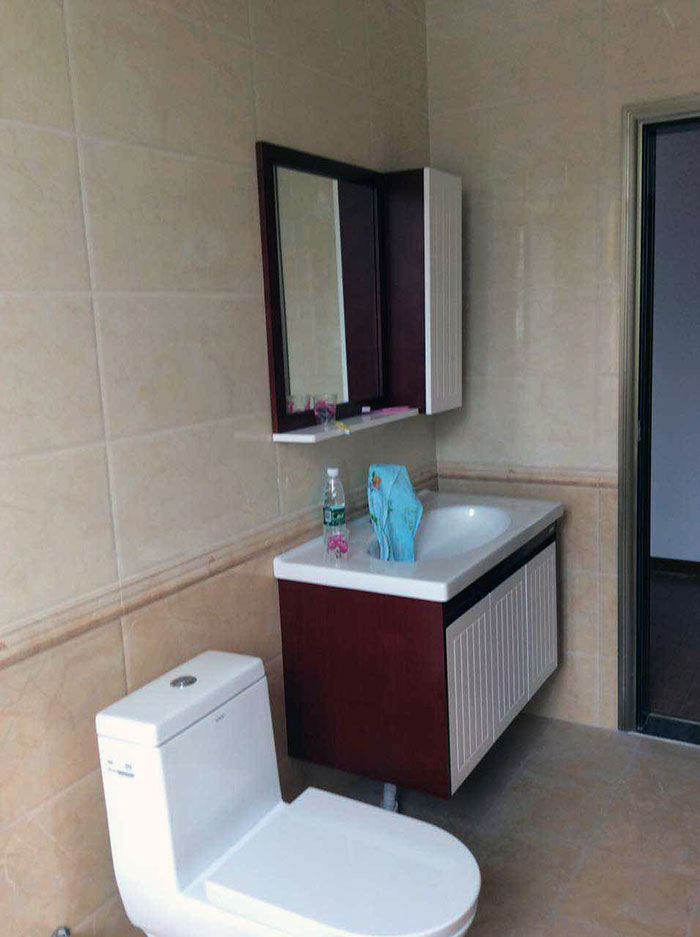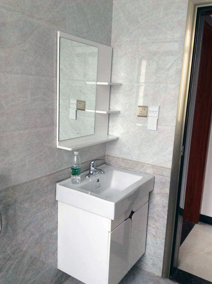 浴室柜比較小巧精致,側(cè)面紅色,柜門及洗手臺則以白色為主,給人干凈、清新的感覺。整個空間鋪貼金艾陶內(nèi)墻磚KPM36015、KPM36016系列,時尚、簡約,為整個浴室空間增添了十足的現(xiàn)代感。