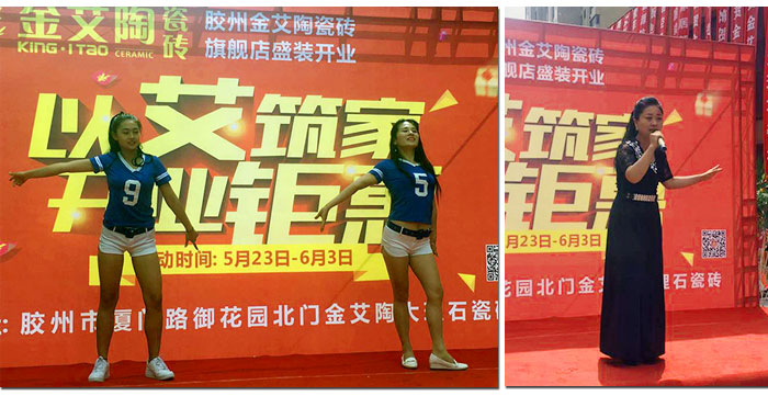 精彩的開場節(jié)目過后,金艾陶瓷磚品牌營銷總經理羅勝首先為本次開業(yè)活動致辭。羅總對金艾陶瓷磚山東膠州專賣店的盛大開業(yè)表示祝賀,同時也期望金艾陶瓷磚山東膠州專賣店能將更多好產品和好服務帶給膠州的消費者。隨后,金艾陶瓷磚山東膠州專賣店總經理李鵬飛為活動致辭。臺上歌舞繚繞,臺下座無虛席,熱鬧非凡。