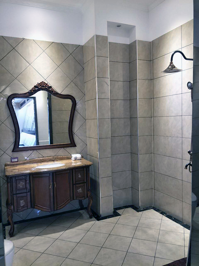衛(wèi)浴空間鋪貼包括淺色上墻,深色下墻及配套花片產(chǎn)品,陶瓷一線品牌金艾陶不僅配套產(chǎn)品齊全,花色也比較新穎。