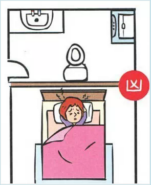 房間里的廁所對到床,情況比房門對到廁所嚴(yán)重:對到頭,會頭痛、思考時不能集中,住久了容易產(chǎn)生腫瘤、中風(fēng)等;對到腰,會腰酸、心臟無力、水腫,住久了容易產(chǎn)生糖尿病、心臟??;對到腳,會坐骨酸痛、膝蓋無力、痛風(fēng)水腫,住久了容易產(chǎn)生意外骨折。