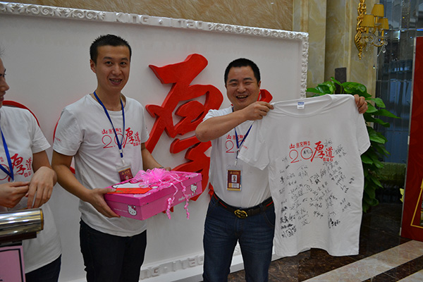 營銷總監(jiān)劉鴻瑞展示由金艾陶員工集體簽名的厚道衫
