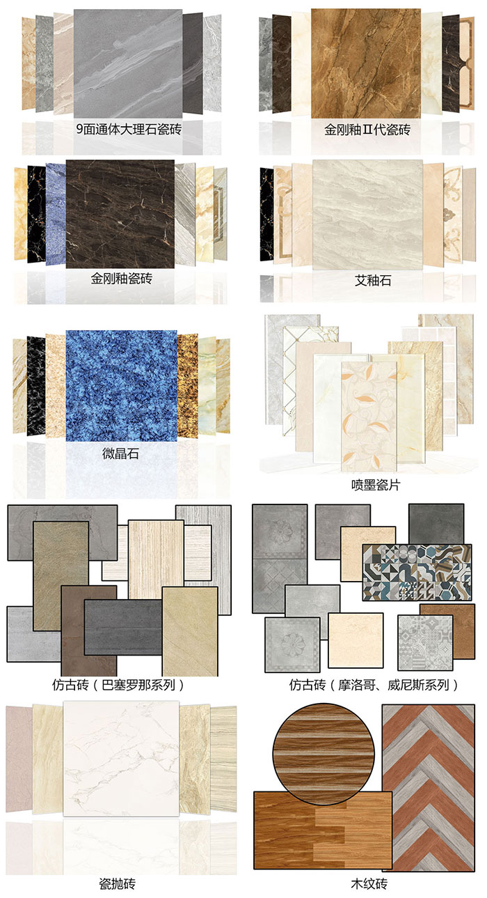 目前擁有緞光釉、瓷拋磚、9面通體大理石瓷磚、金剛釉Ⅱ代瓷磚、仿古磚、木紋磚、艾釉石、2.0厚微晶石、內(nèi)墻磚(瓷片)、拋光磚等多個品類200多款產(chǎn)品花色。