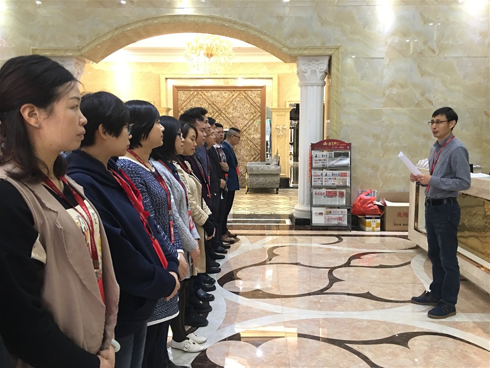 隨后,營銷總經(jīng)理羅勝羅總發(fā)表重要講話,表示此次陶博會要全力以赴協(xié)助銷售展開工作。前線銷售人員分為A、B兩組,全力展開客戶搜羅工作。羅總還帶隊唱隊歌,鼓舞了士氣,引起臺下紛紛響應,使大會推向了高潮。
