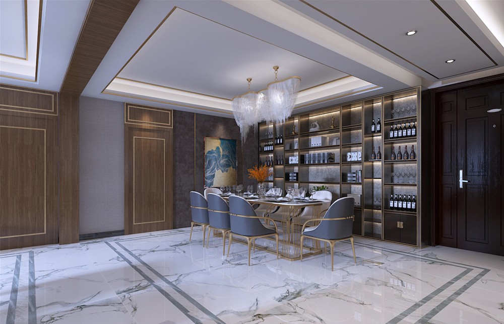 線條流暢的藏藍色餐桌椅調節(jié)餐廳的素靜