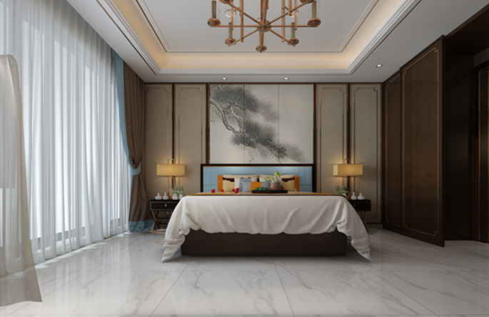 臥室家具采用實木紋,高貴大氣,設(shè)計成松子樣式的屏風(fēng)完美的體現(xiàn)了不可居無松的文人理念,配合深蘊古風(fēng)的燈具,更顯古典。白色系落地窗簾與地磚相得益彰,整個臥室透著一絲絲涼意。