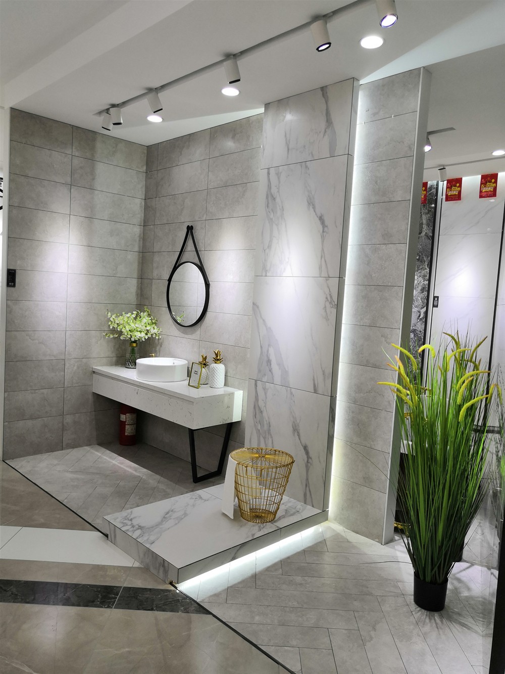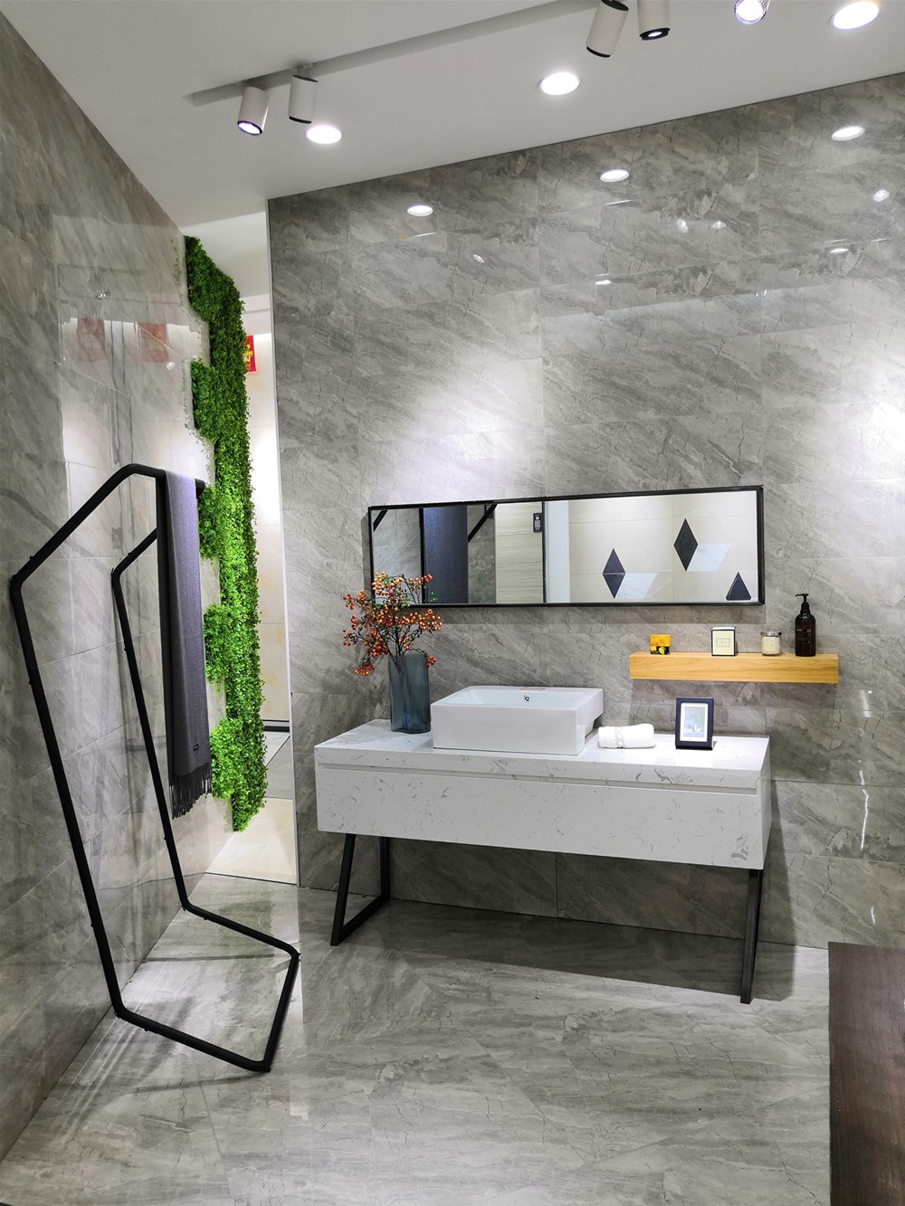 這款產(chǎn)品是灰色調(diào)大紋理,從設計考慮是不宜做太多的鋪貼手法或者水刀。因為紋理足夠豐富,我們只采用400*800直接純色上墻,這樣就把產(chǎn)品的特性表現(xiàn)最極致。