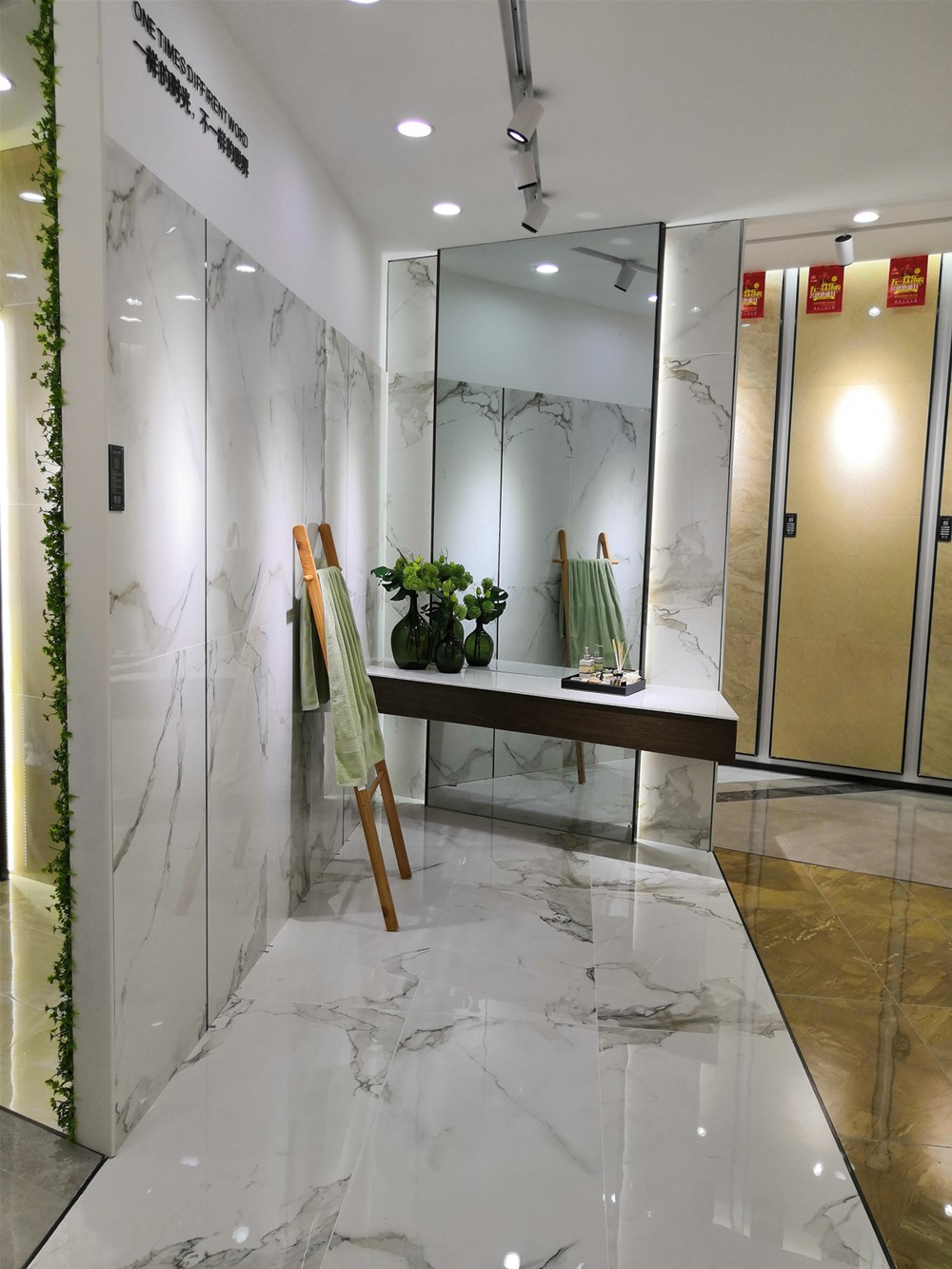 墻面用的是我們的15度緞光釉卡拉卡白(KFD8801)和九面通體大理石羅馬砂巖(KA9M001)