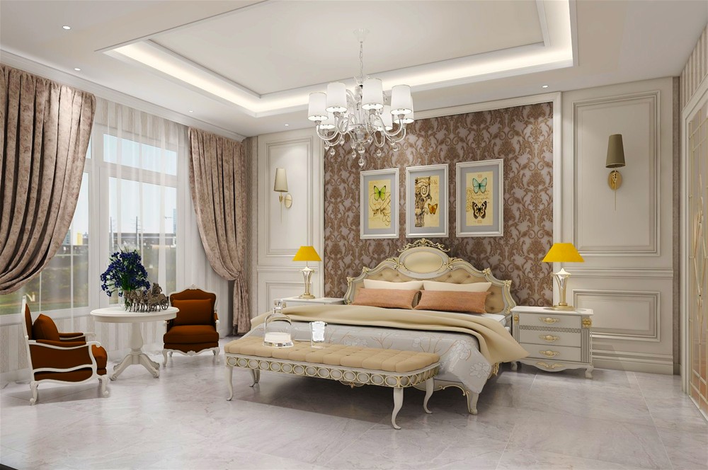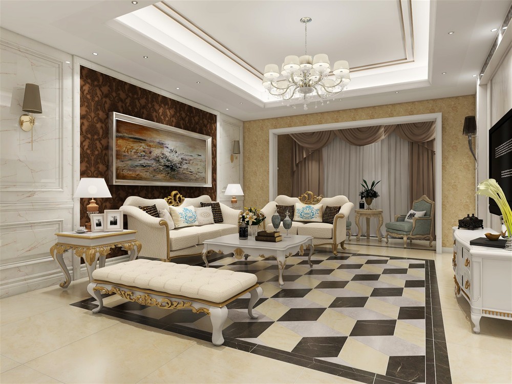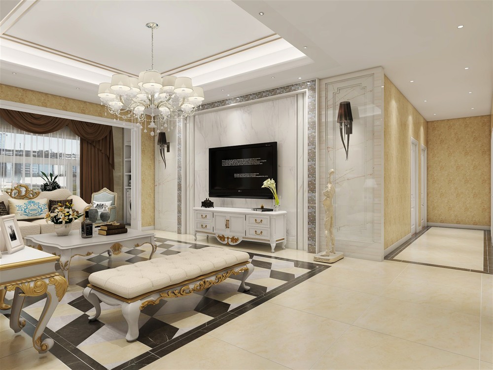 由仿大理石紋理15°緞光釉瓷磚裝飾的電視墻,紋理清晰、素雅,地磚由三個顏色鋪設(shè)的立體圖形,讓地面更有立體感和設(shè)計感。沙發(fā)、茶幾、電視柜等家具雕飾簡潔,更具輕奢感。燈飾摒棄繁雜的水晶吊燈采用相對線條簡化的吊燈,完美演繹簡歐輕奢品味。