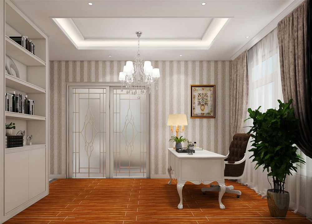 不同于中式風(fēng)格的優(yōu)雅含蓄,簡歐書房多給人輕柔高雅之感。例如白色的書桌與書柜相配,又或是大氣高貴的窗簾簾幔,連墻紙上精細(xì)花紋,也讓人覺得欣喜。深木色的地板與綠植,讓整個空間的色調(diào)豐富了許多。